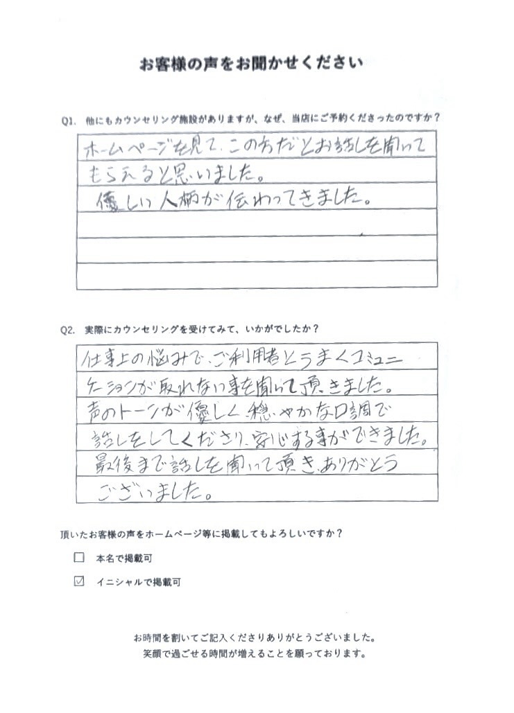 声のトーンが優しく、穏やかな口調で話しをしてくださり、安心する事ができました。最後まで話しを聞いて頂き、ありがとうございました。