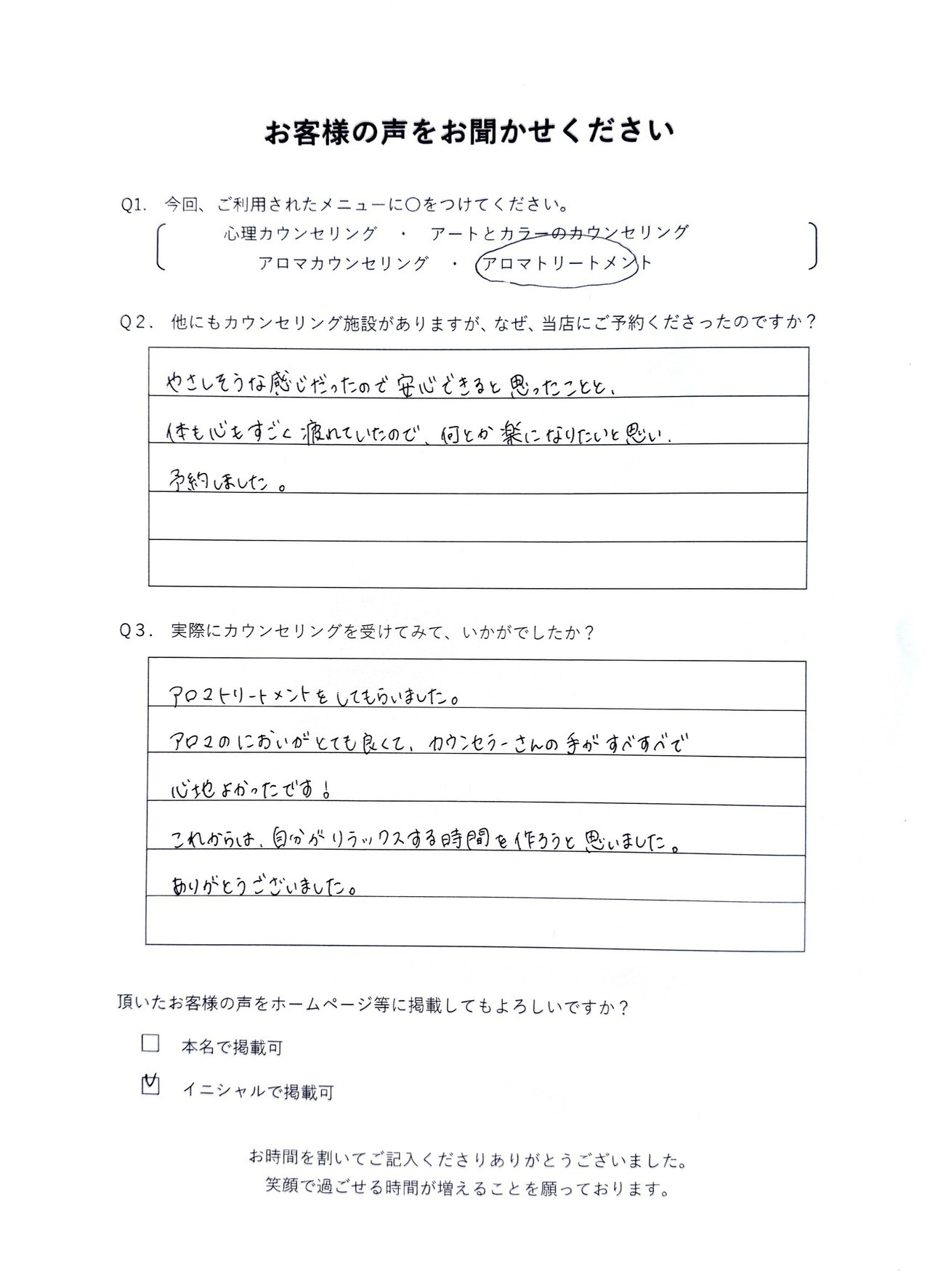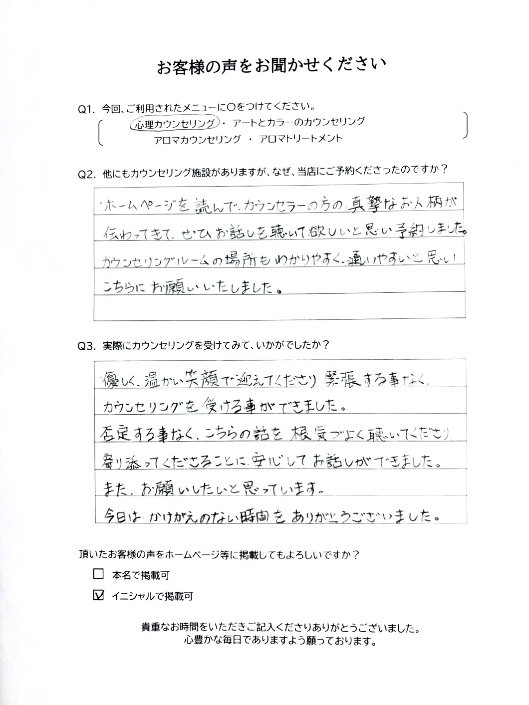 この度は、心理カウンセリングをご利用くださいまして、ありがとうございます。