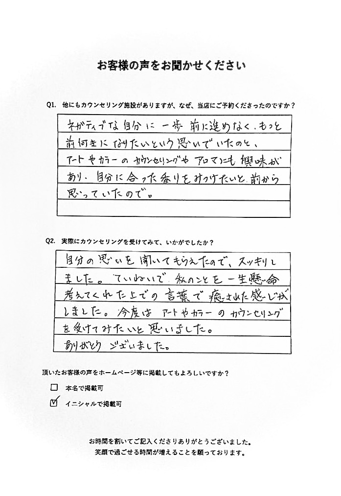 自分の思いを聞いてもらえたので、スッキリしました。ていねいで、私のことを一生懸命考えてくれた上での言葉で癒された感じがしました。今度は、アートとカラーのカウンセリングを受けてみたいと思いました。ありがとうございました。