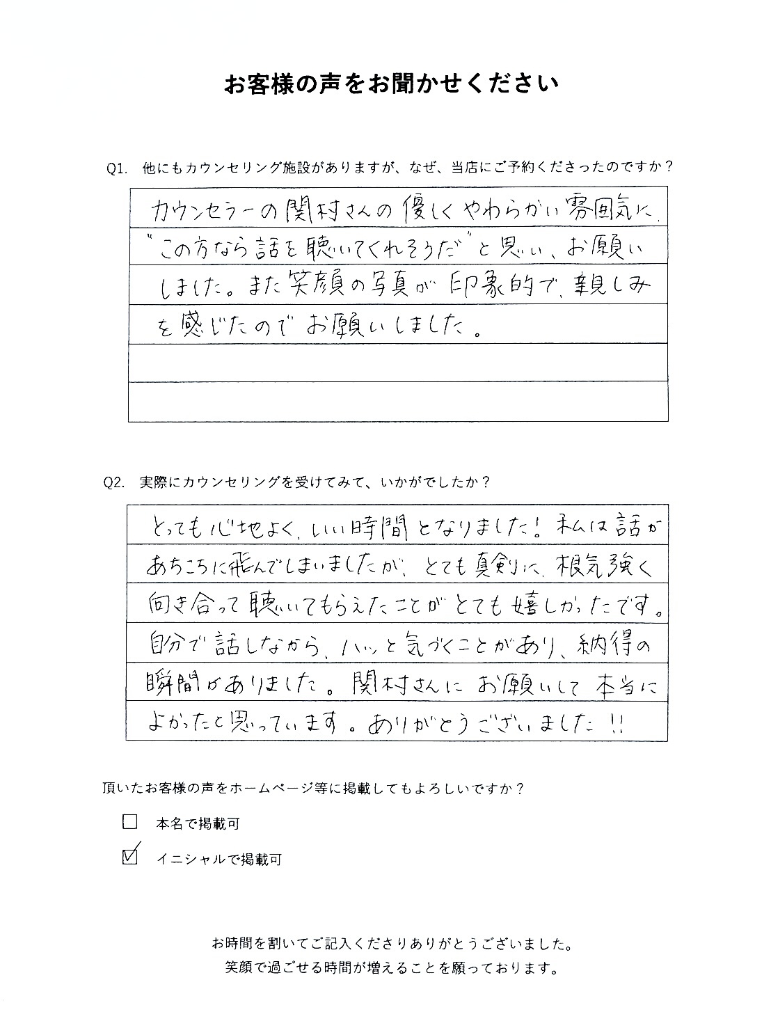 カウンセラーの関村さんの優しくやわらかい雰囲気に、〝この方なら話を聴いてくれそうだ ″と思い、お願いしました。また笑顔の写真が印象的で、親しみを感じたのでお願いしました。